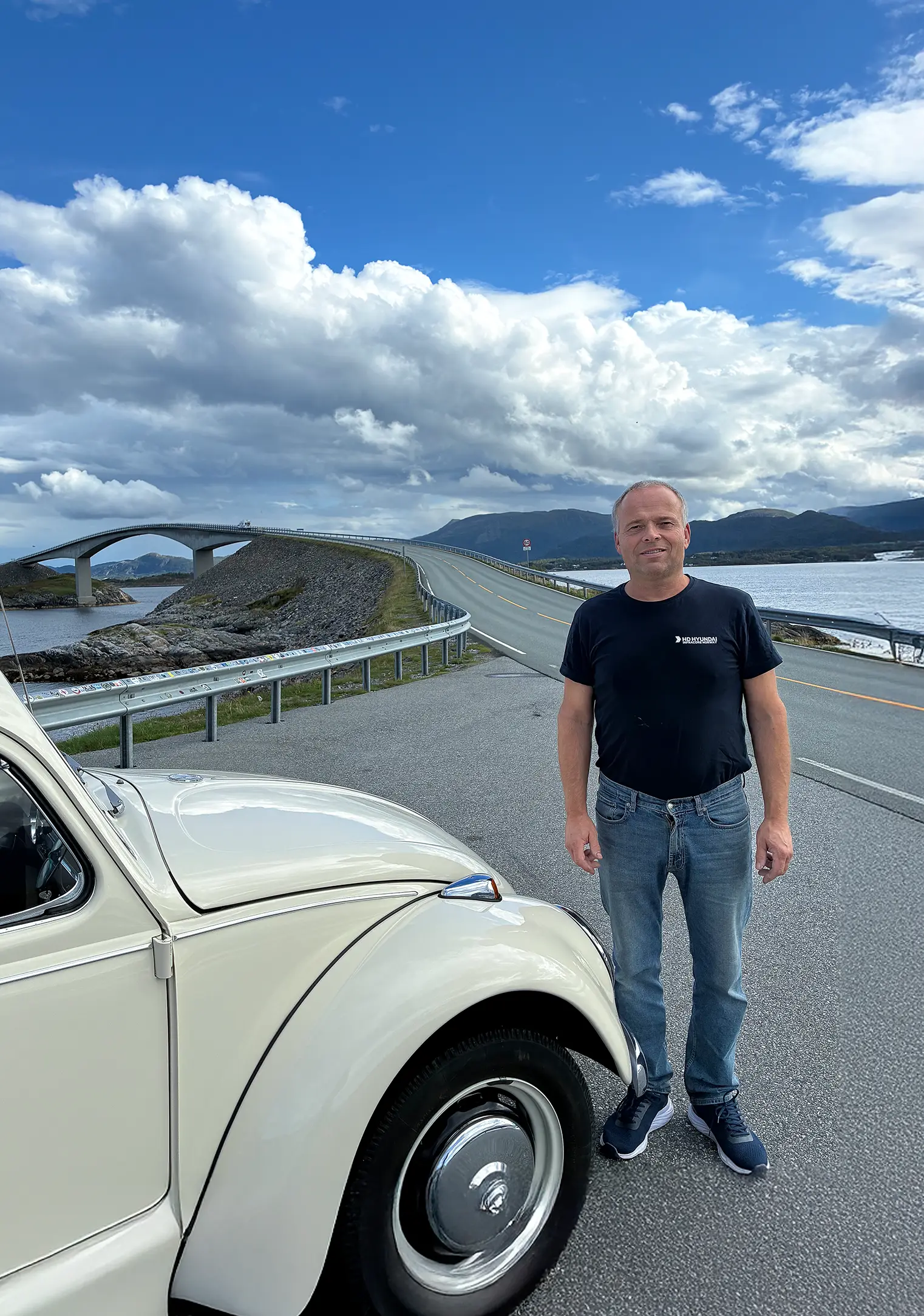 Da klokken ble 20:00 på kvelden, stanset Arne sin veteranbil, en 1967-modell Volkswagen boble, ved den idylliske Atlanterhavsvegen. Nå ville de lytte til meg på Telekirken.